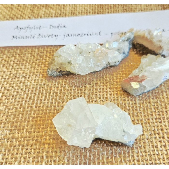 Originálna mini drúzka Apofylitu 27 g. Nálezisko India. Rozmery : 4 x 3 x 2 cm. Kubické kryštály Apofylitu sú medzi liečiteľmi označované ako Kozmická pamäť - sú to nositelia správ z minulých životov. Používajú sa na veštenie, pretože spájajú telo i myseľ so spirituálnymi vedami, pomáhajú jasne vidieť a dosiahnuť vytúžené priania v budúcnosti, ktoré sú reálne a splniteľné.