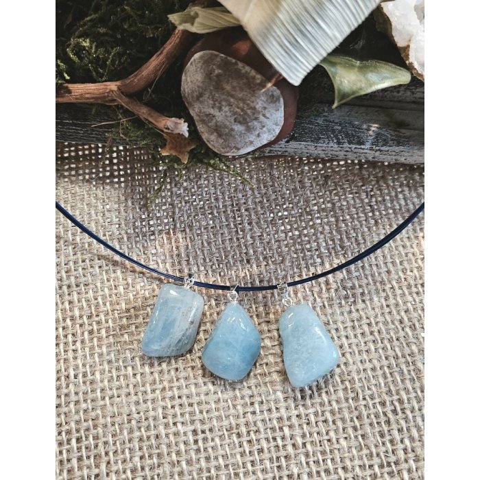 Prívesok z pravého polodrahokamu Aquamarín (Akvamarín). Úchyt je zo striebra. Aquamarín nosíme ak chceme stretnúť spriaznenú dušu, duchovného partnera. Je kameňom duševnej čistoty. Prívesky revitalizujeme a čistíme na ametystovej, krištáľovej drúze alebo mesačným splnom.
