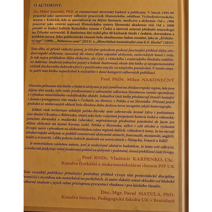 Alchymisti netušili, že to nie je možné a práve týmto hľadaním, v skutočnosti márnym, prekladali cestu budúcej chémii. Rovnako neúspešne skončili pokusy o prípravu univerzálneho lieku. To sú len dve oblasti alchýmie, ktorá však zahŕňala oveľa viac, ako to naznačuje táto kniha. Je zameraná na stredoeurópsky región, kde sú dejiny tejto náuky stále málo preskúmané, a je to oblasť, ktorú zahraničná odborná literatúra napospol zabúda, s výnimkou mimoriadneho rudolfínského obdobia. Aj v ňom sa ale zvyčajne pozornosť sústreďuje na dvojicu John Dee - Edward Kelley. Jednotlivé bloky knihy predstavujú čitateľovi taktiež domácich protagonistov tejto náuky v Čechách a na Morave, v Poľsku a na Slovensku.