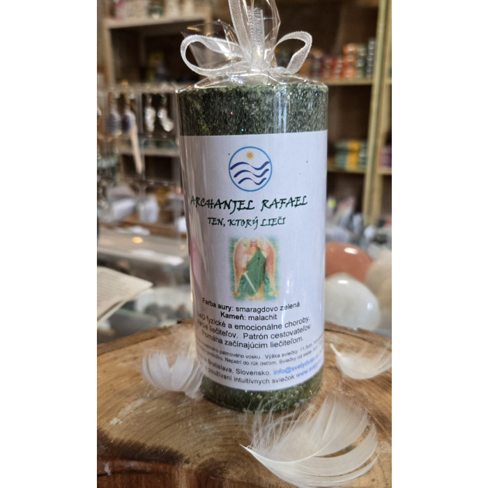 Ochranná sviečka archanjel Rafael - ten, ktorý lieči. Ručne zhotovená sviečka malachitovo zelenej farby pomáha liečiť fyzické i emocionálne choroby. Vedie liečiteľov. Pomáha začínajúcim liečiteľom. Patrón cestovateľov. Táto ručne zhotovená sviečka sa používa pri vizualizácií, posilnení zámeru v meditácií, pre prácu s duševnou obnovou alebo ako amulet pri cestovaní alebo v novom prostredí.